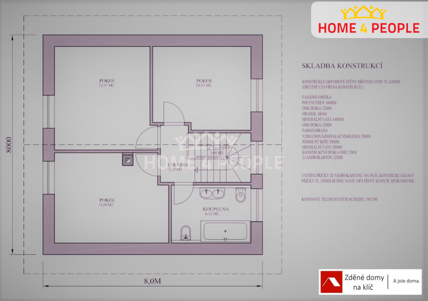 Zprostředkujeme Vám výstavbu patrového domu Klára v provedení zděná stavba na klíč s dispozicí 5+kk o užitné ploše 93 m2 a zastavené ploše 64 m2. Výstavbu provedeme na Vašem pozemku - není součástí ceny. Zdarma prověříme, zda lze tento dům na vašem pozemku postavit, prověříme i dostupnost sítí a územní plán. V projektu jsou možné variabilní úpravy dispozice (posuny příček či oken). Jedná se o patrový dům, ideální až pro 5 člennou rodinu s nízkými provozními náklady. Uvedená cena je za kompletní výstavbu domu na klíč, včetně DPH, projektové dokumentace, vyřízení stavebního povolení, základové desky až po kolaudaci. V uvedené ceně můžete počítat s finálními povrchovými úpravami exteriéru i interiéru, a to včetně elektroinstalací, sanitárního vybavení s bateriemi, interiérovými dveřmi včetně obložek, vytápění je řešeno teplovodním podlahovým topením v kombinaci tepelného čerpadla se 180L zásobníkem na teplou vodu. Za příplatek změníme systém vytápění nebo vystavíme komín pro krbové kamna nebo pro využití krbové vložky. Garáž spojená s domem, za příplatek. Pro náročnější klienty máme nabídku nadstandardního vybavení chytré domácnosti, klimatizaci, externí žaluzie a rolety a další. Doba výstavby cca 14 měsíců od vydání stavebního povolení a stavbu zahájíme do 10 dnů od jeho vydání. Smlouvy o dílo zašleme na vyžádání včetně vzorového položkového rozpočtu. Tento typový dům Vám rádi ukážeme v rozpracovaném stavu nebo hotovém, kde se seznámíte se skladbou materiálů a můžete si tak projít dispozice domu. Podrobnější informace, včetně změny stavebního materiálu například na dřevostavbu, naleznete na webových stránkách naší firmy Zděné domky na klíč. Máte-li svůj projekt nebo jen nějakou představu, pošlete nám ji a my vám jej naceníme. Pomůžeme i s hledáním vhodného pozemku dle zaslaného zadání. Fotografie domů jsou domy, které jsme jednak realizovali, ale také vám je rádi ukážeme. Doporučuji prohlídku tohoto domu! Ev. číslo: 28280. Energetický štítek: A (39 kWh/m2/rok).