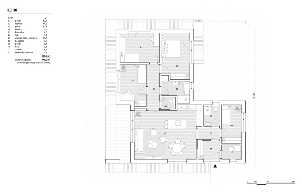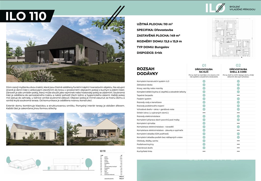 Ve spolupráci s majitelem pozemku, vám exkluzivně nabízíme jedinečnou příležitost pořídit si úspornou dřevostavbu na klíč - model ILO 110. Tato nabídka zahrnuje prostorný pozemek o velikosti 868 m2 včetně zajištění kompletní výstavby. Co je zahrnuto v ceně? Pozemek i dům s kompletním dokončením interiéru, včetně projektové dokumentace, ČOV, retenční nádrže, přípojek a základních terénních úprav. Vybavené koupelny a WC - včetně sanitární výbavy. Vnitřní dveře, podlahové krytiny, obklady a dlažby - vše ve vysoké kvalitě. Moderní design a praktické řešení pro pohodlné bydlení. Upozornění: Kuchyňská linka není součástí dodávky, abyste si ji mohli přizpůsobit svým představám. Proč si vybrat právě tento dům? ✅ Nízké náklady na bydlení: Úsporná dřevostavba s kvalitním zateplením. ✅ Komfortní teplo: Teplovodní podlahové vytápění s tepelným čerpadlem a TUV nádrží. ✅ Kompletní infrastruktura: Napojení na všechny inženýrské sítě. ✅ Ekologické řešení: Retenční nádrž na dešťovou vodu. ✅ Připraveno k životu: Včetně základních terénních úprav. Přizpůsobte si ho podle sebe! Máte možnost ovlivnit vzhled svého nového domova: Vyberte si odstíny vinylových podlah, koupelnových obkladů a dekorů dveří. Zvolte si ze dvou odstínů venkovní fasády, které se vám nejvíce líbí. Dispozice a parametry: Typ domu: Bungalov Dispozice: 5+kk Užitná plocha: 110 m2 Zastavěná plocha: 149 m2 Rozměry domu: 13,5 x 13,9m Nenechte si ujít tuto jedinečnou šanci na moderní a úsporné bydlení! Podrobný popis dřevostavby a půdorys naleznete v galerii. Zaujala vás tato nabídka? Kontaktujte nás ještě dnes a domluvte si prohlídku!