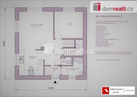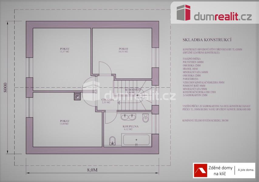 Dumrealit.cz Vám zprostředkuje výstavbu patrového domu 5+kk s užitnou plochou 93m2 v Bojkovicích. Součástí uvedené ceny je i pozemek o velikosti 1227m2 o šíři 13m a délce cca 88m, který je územním plánem schválen pro výstavbu rodinného bydlení. Jedná se o patrový dům, ideální až pro 5 člennou rodinu s nízkými provozními náklady. Uvedená cena je za kompletní výstavbu domu na klíč, včetně DPH, projektové dokumentace, vyřízení stavebního povolení, základové desky až po kolaudaci. V projektu jsou možné variabilní úpravy dispozice (posuny příček či oken). V uvedené ceně můžete počítat s finálními povrchovými úpravami exteriéru i interiéru, a to včetně elektroinstalací, sanitárního vybavení s bateriemi, interiérovými dveřmi včetně obložek, vytápění je řešeno teplovodním podlahovým topením v kombinaci tepelného čerpadla se 180L zásobníkem na teplou vodu. Za příplatek změníme systém vytápění nebo vystavíme komín pro krbové kamna nebo pro využití krbové vložky. Garáž spojená s domem, za příplatek. Pro náročnější klienty máme nabídku nadstandardního vybavení chytré domácnosti, klimatizaci, externí žaluzie a rolety a další. Doba výstavby cca 14 měsíců od vydání stavebního povolení a stavbu zahájíme do 10 dnů od jeho vydání. Smlouvy o dílo zašleme na vyžádání včetně vzorového položkového rozpočtu. Možnost výstavby pouze hrubé stavby za 2.816.000,-Kč. Tento typ domu Vám rádi ukážeme, který je k dispozici nedaleko Bojkovic. Seznámíte se se skladbou materiálů a můžete si tak projít dispozice domu. Podrobnější informace, včetně změny stavebního materiálu například na dřevostavbu, naleznete na webových stránkách naší spolupracující firmy Zděné domky na klíč. Máte-li svůj projekt nebo jen nějakou představu, pošlete nám ji a my vám jej naceníme. Změna na jiný typ domu je možná. Pomůžeme i s hledáním vhodného pozemku dle zaslaného zadání. Fotografie domů jsou domy, které jsme jednak realizovali, ale také vám je rádi ukážeme. Doporučuji prohlídku! Ev. číslo: 653506. Energetický štítek: A (49 kWh/m2/rok).