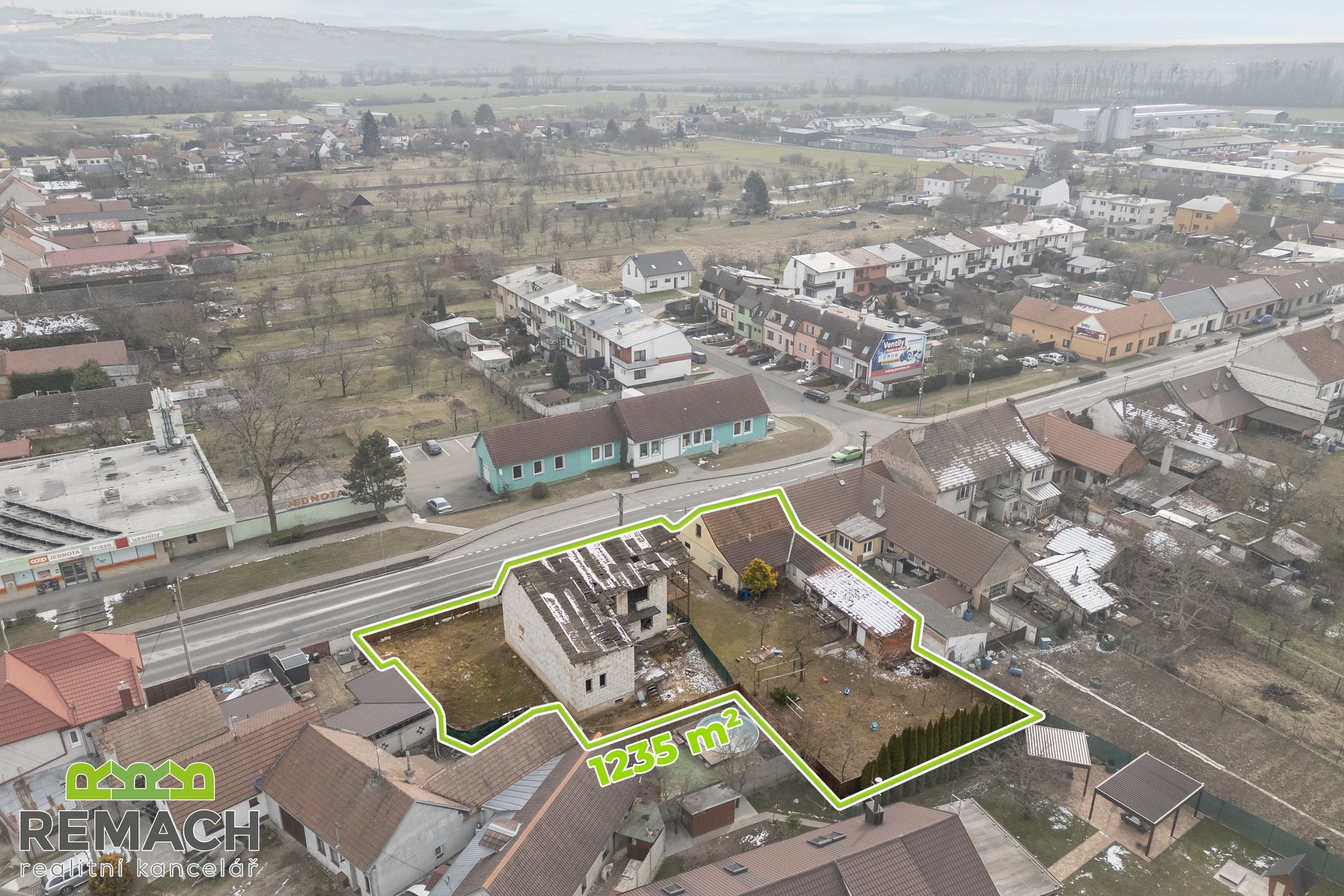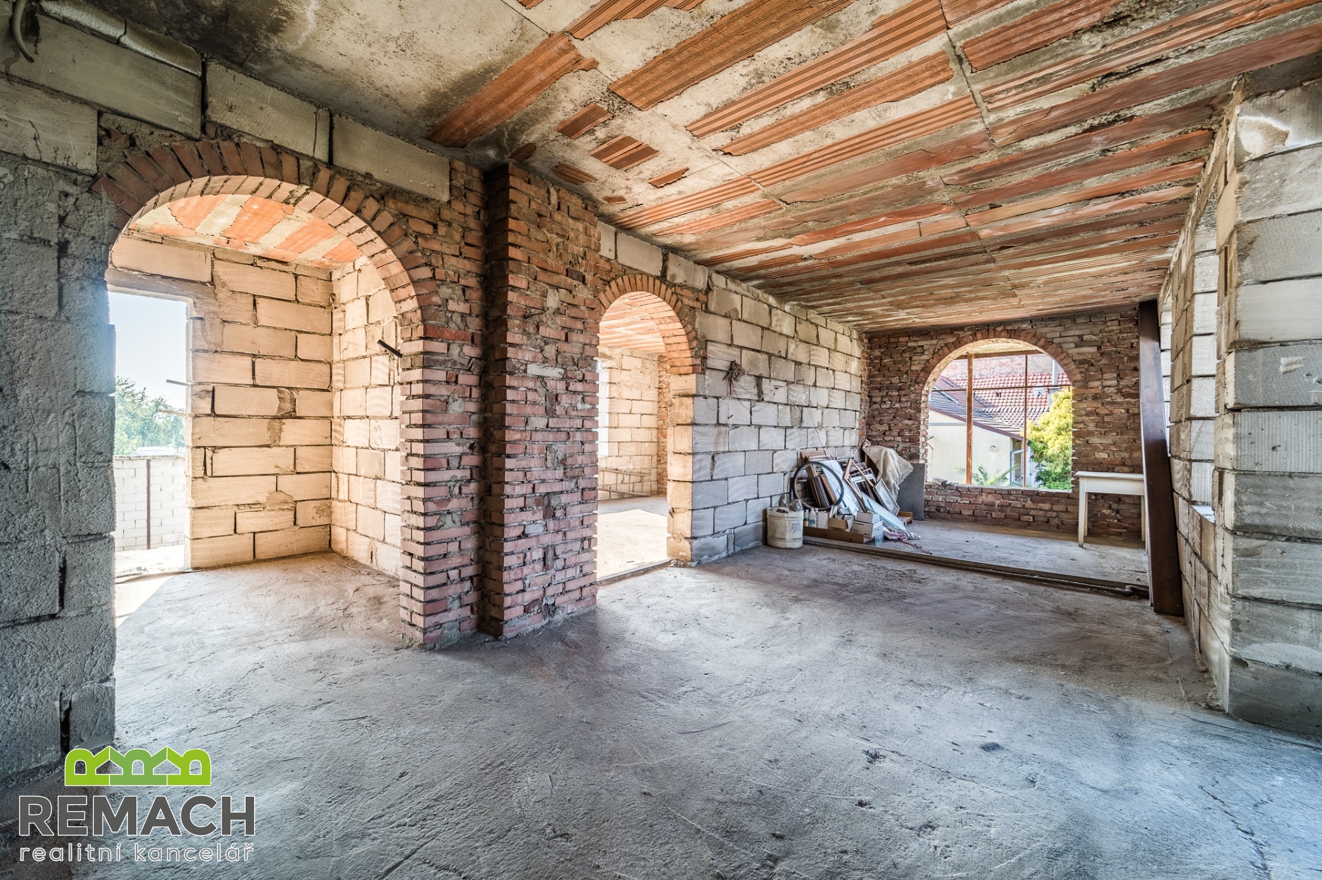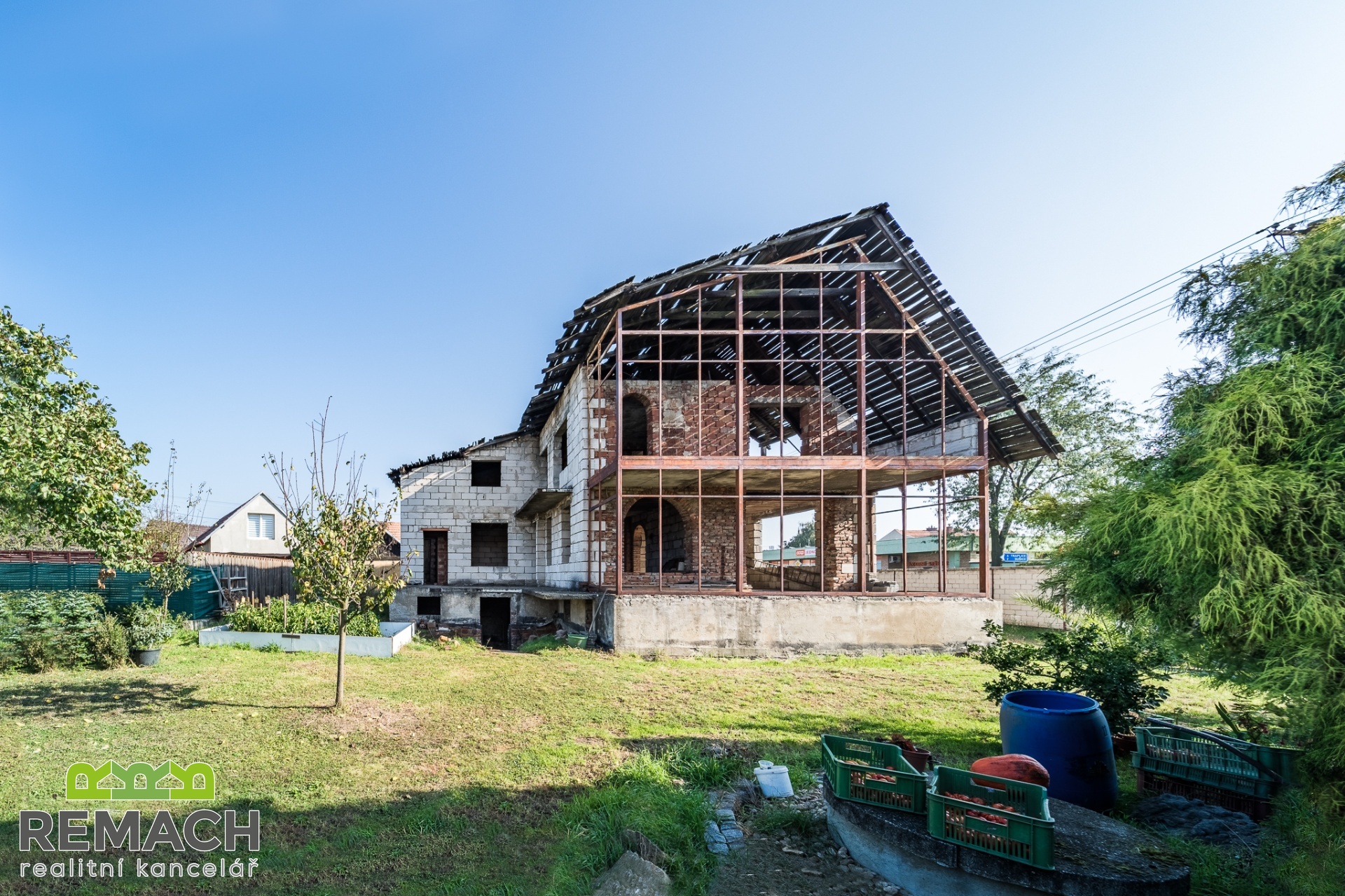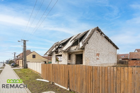 Dva domy, zastavěná plocha každého z nich je 191 m2 a 101 m2. Celková rozloha pozemku je 1235 m2. Z pravé strany od rozestavěného domu bylo počítáno s velkou garáží, přičemž mezi domy se nachází další prostor pro stavbu třetího rodinného domu. Za domy a mezi nimi je prostorná zahrada. - Pro investora je velkou výhodou, že byla zpracována studie celého projektu, který počítal se třemi samostatně stojícími domy: Dispozice: v každém RD 3 byty (1 byt / podlaží), celkem 9 bytů Zastavěná plocha (celkem): 310 m2 (≈ 103 m2 / dům) Podlažnosti: 3 nadzemní podlaží (1NP, 2NP, podkroví) Studie obsahuje nejen souhrn nákladů podle profesí a materiálu, ale i fáze financování projektu a návrh podmínek úvěru. - A pokud chcete nemovitost pro vlastní bydlení, tak pravý rozestavěný cihlový dům byl navržen s dispozicí 6+1 s plochou pozemku 637 m2, z toho zastavěnou plochou 191 m2. V přízemí je naprojektován prostorný obývací pokoj napojený na kuchyni s jídelním koutem, zimní zahradou, pracovním koutem a pokojem, případně pracovnou, dále koupelnou s toaletou, vedle domu garáž pro dvě auta. V prvním patře jsou tři samostatné ložnice a koupelna, dále druhá zimní zahrada. Celý dům je podsklepen a nabízí i prostorný klenutý sklep, umístěný pod suterénem domu. Z domu je krásný výhled do okolí, také na hrad Buchlov a Barborku. Výhodou je, že dispozici domu si může budoucí majitel ještě upravit podle vlastní představy, případně rozdělit na dvě samostatné bytové jednotky. - Levý přízemní dům je ihned obyvatelný. Dispozičně řešen jako 2+1 s velkou vstupní chodbou. Za domem se nacházejí hospodářské budovy a již zmíněná prostorná zahrada s ovocnými stromy.